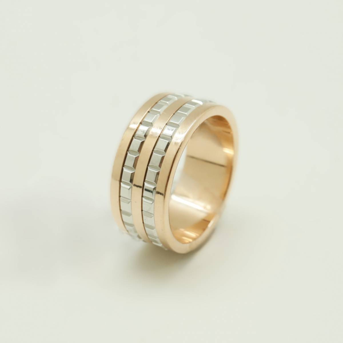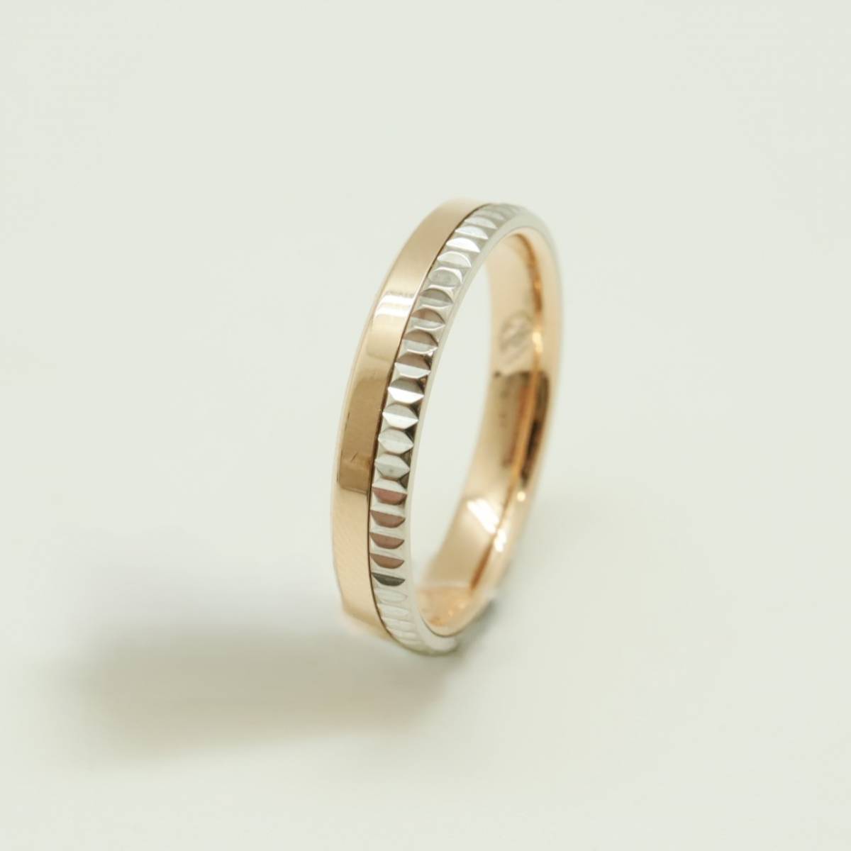 L’alliance homme révèle une allure contemporaine et masculine grâce à ses deux rangs : un rang en or rose poli pour la chaleur, et un rang en platine ciselé pour la distinction. Cette alliance bicolore exprime l’équilibre entre simplicité et élégance.