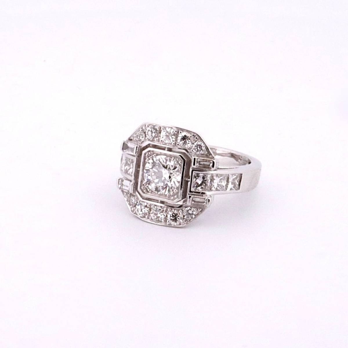 Au centre, un diamant taille brillant capte immédiatement le regard. Il est mis en valeur par un entourage géométrique finement travaillé, soulignant sa brillance et sa profondeur. Autour de cette pierre centrale, une succession de diamants sertis avec précision vient enrichir la monture, créant un jeu de lumière subtil et continu. Les diamants baguettes et brillants disposés sur le plateau et les épaules de la bague renforcent la symétrie de l’ensemble et apportent une présence visuelle remarquable.