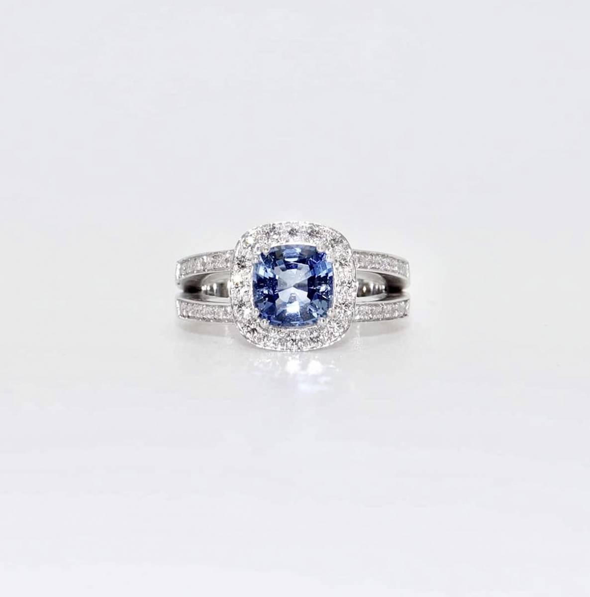 saphir bleu taille coussin au centre, avec un entourage de