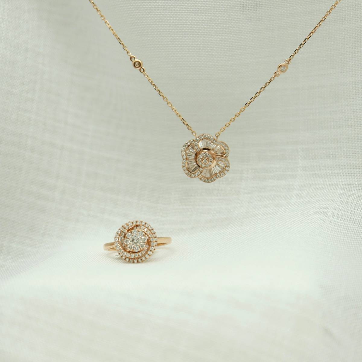 Au centre, un somptueux bouquet de diamants étincelants est minutieusement serti pour venir créer le cœur de la fleur. Autour, deux rangées concentriques de diamants viennent dessiner avec grâce les pétales délicats de la rose, dans un jeu d’éclat et de volume remarquable. Chaque pierre, sélectionnée avec soin pour sa pureté et sa brillance, sublime l’ensemble par une lumière à la fois douce et captivante.