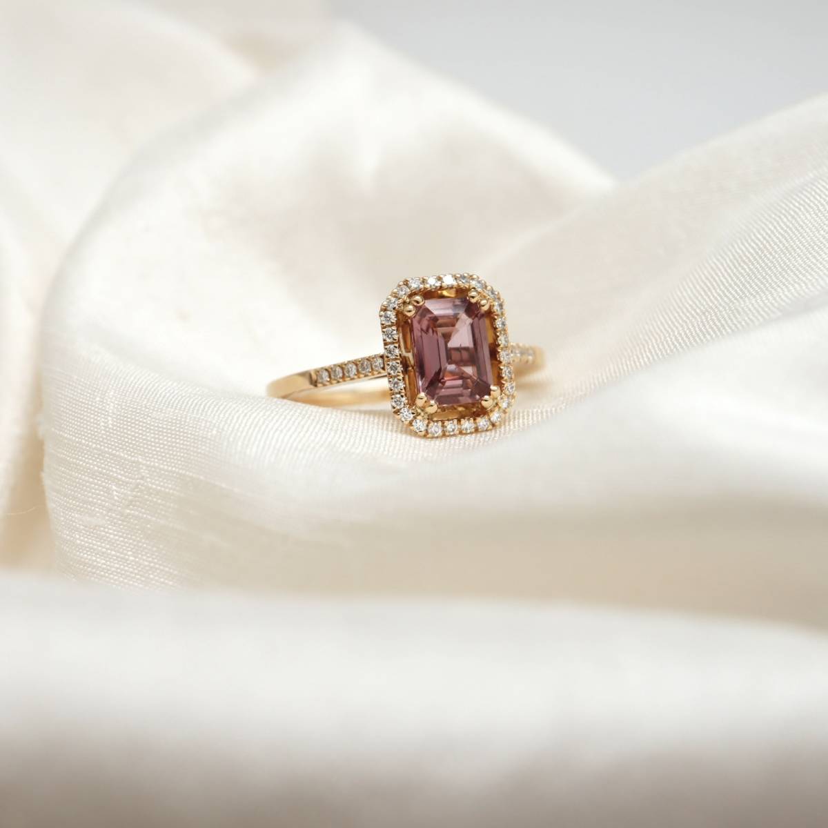 Bague de fiançailles moderne or jaune 18 carats saphir rose rare entourage diamants à Bordeaux