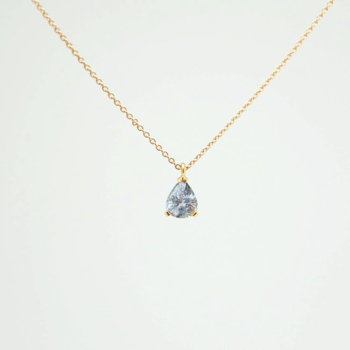 En écho à ce bijou d’exception, un collier en or rose 750 millièmes se pare d’un saphir bleu lavande taille poire. Suspendue avec délicatesse, la pierre diffuse ses nuances changeantes au gré des mouvements, tel un éclat de ciel au bout d’un rayon de lumière. Ensemble, ces créations forment un duo harmonieux, symbole d’amour raffiné, d’éternité et de rêve.