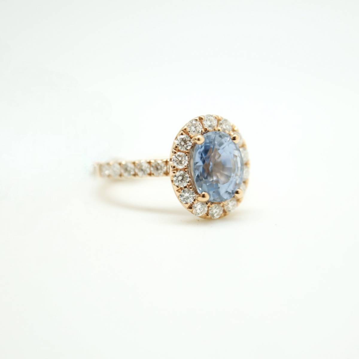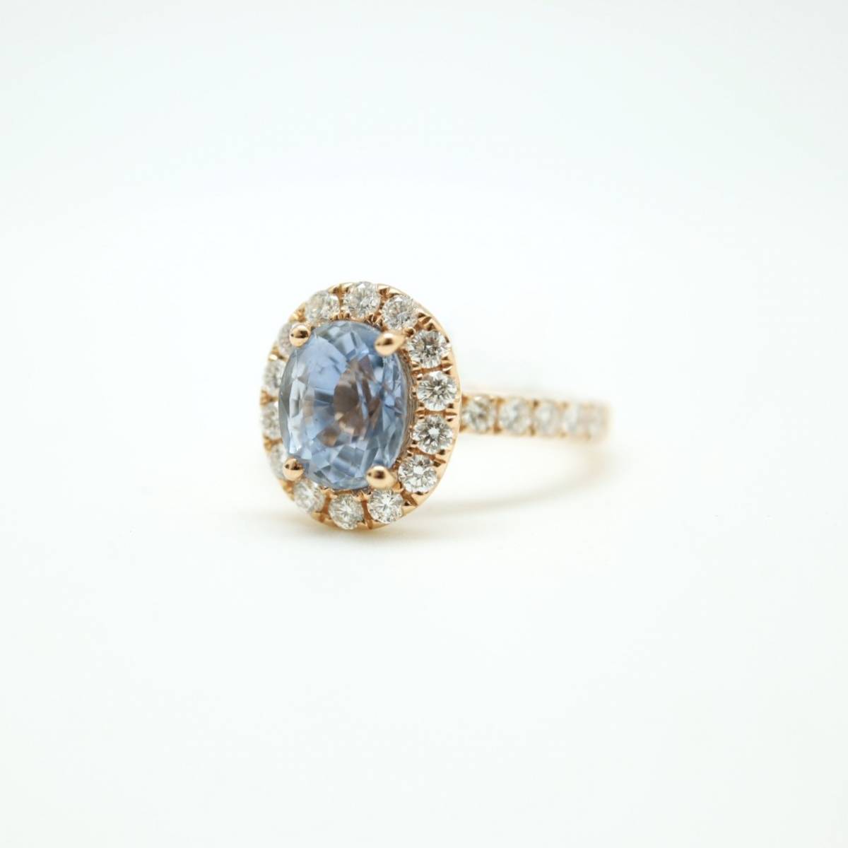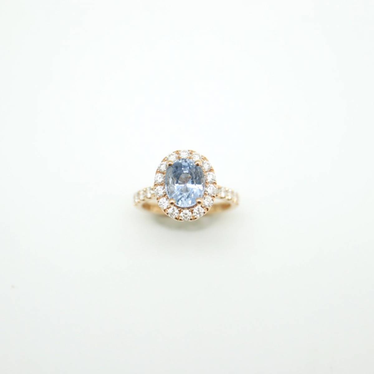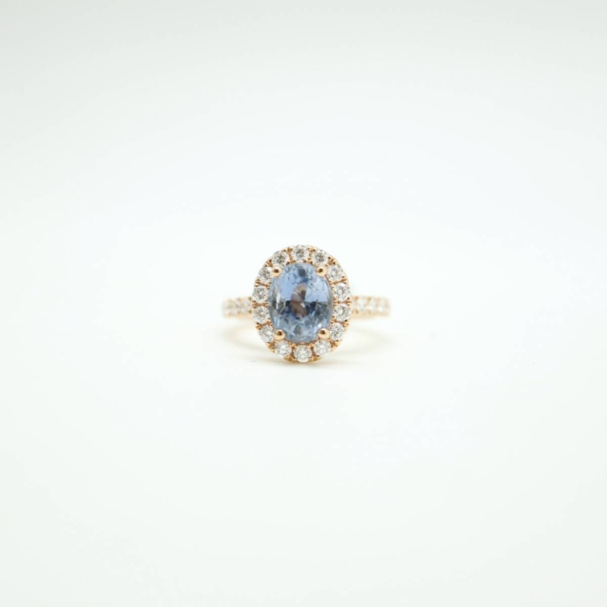 Autour de cette gemme précieuse, une constellation de diamants taille brillant vient magnifier son éclat. Chaque diamant capte et renvoie la lumière, créant une aura scintillante qui enveloppe le saphir d’un halo de pure clarté. Le corps de la bague, également pavé de diamants, prolonge cette brillance infinie sur un anneau d’or rose aux reflets chauds et rosés, qui sublime à merveille la douceur du bleu lavande.