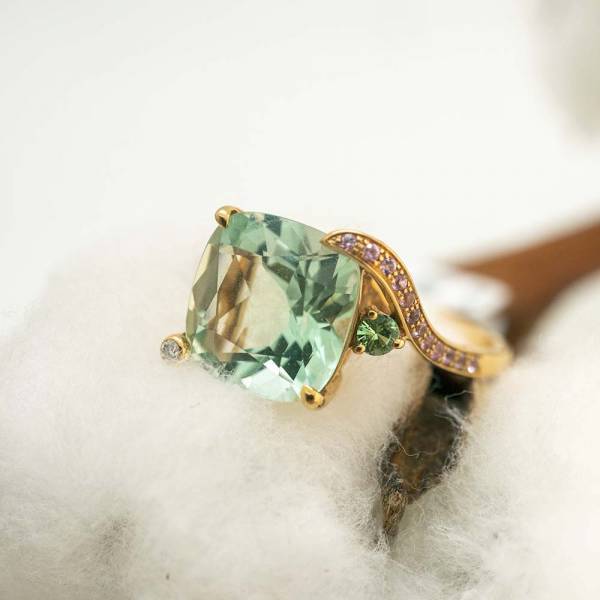 Conçue pour capturer l'éclat des gemmes, cette bague marie l’or 750 millièmes aux pierres précieuses et fines avec des teintes bleues et vertes, parfaites pour celles et ceux qui cherchent une pièce empreinte de douceur et de sérénité.