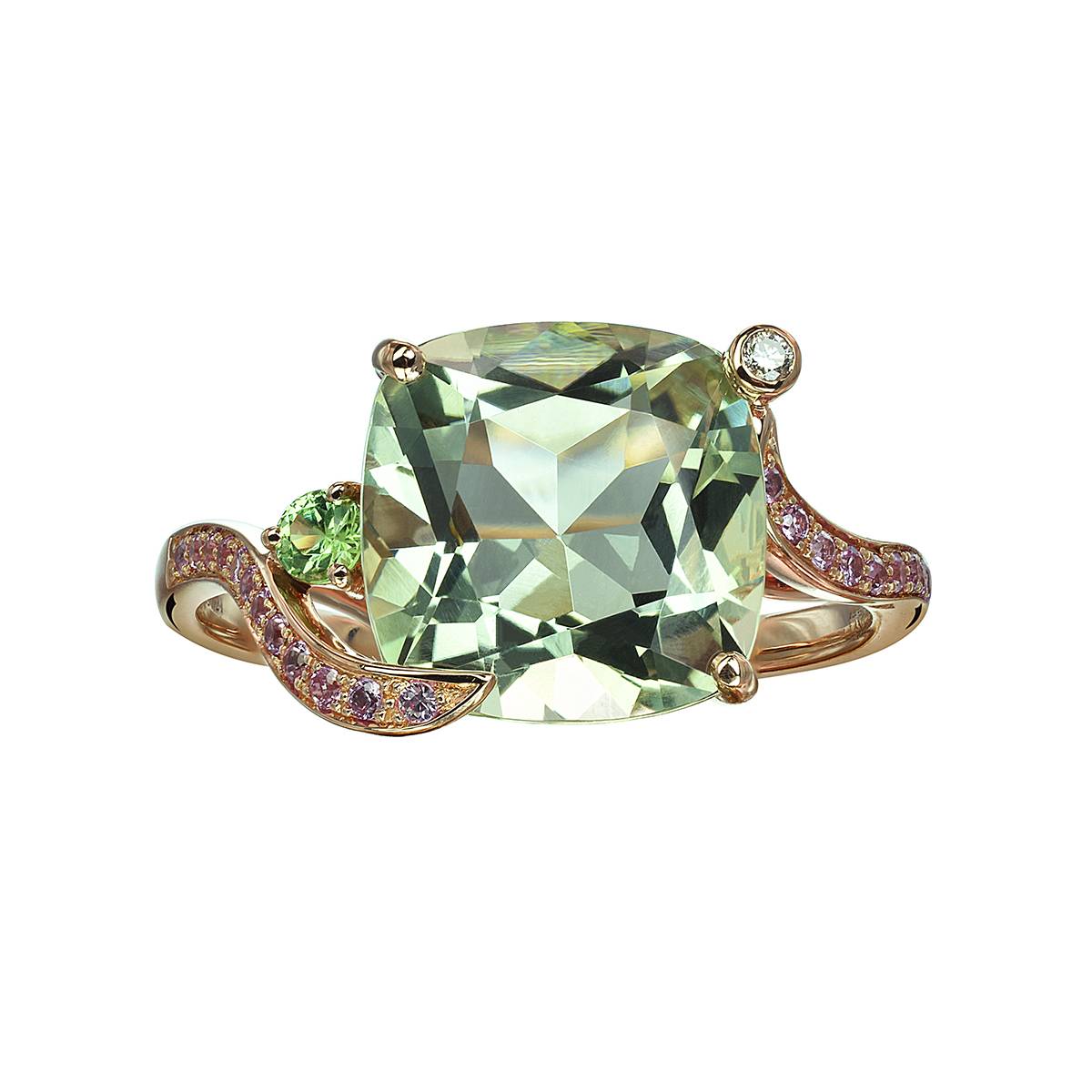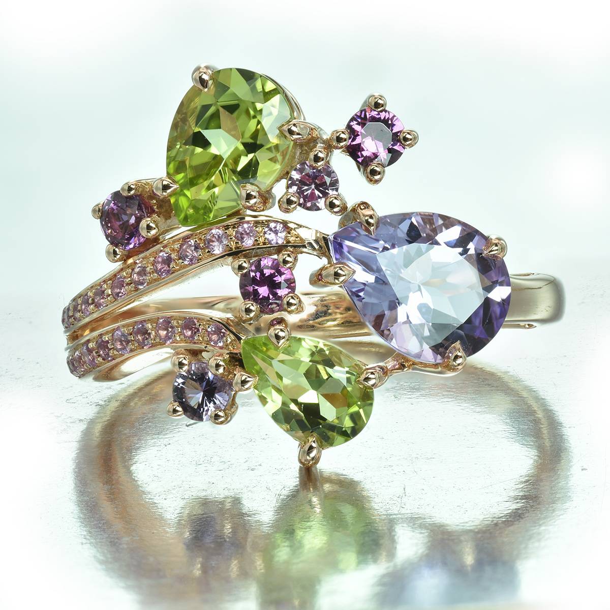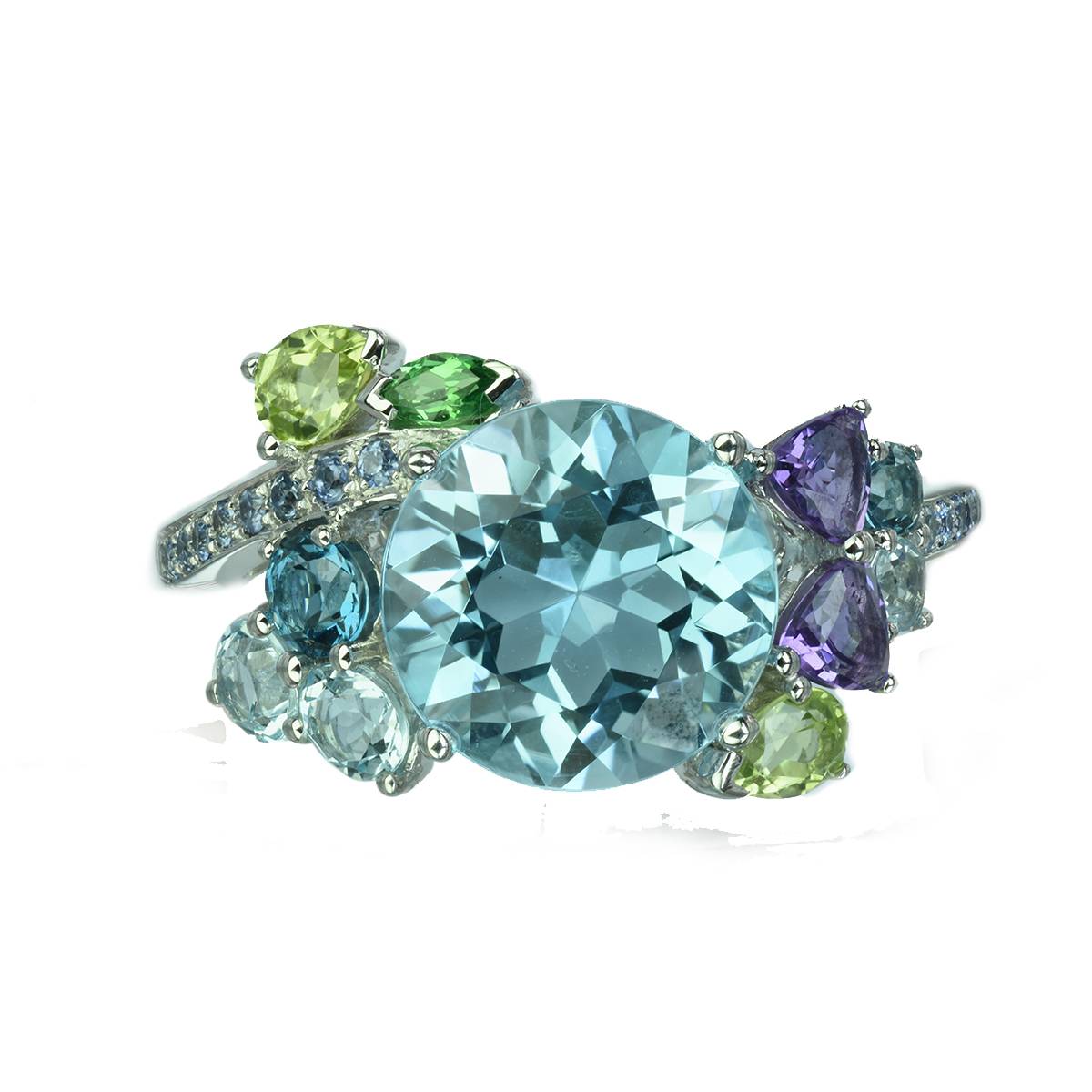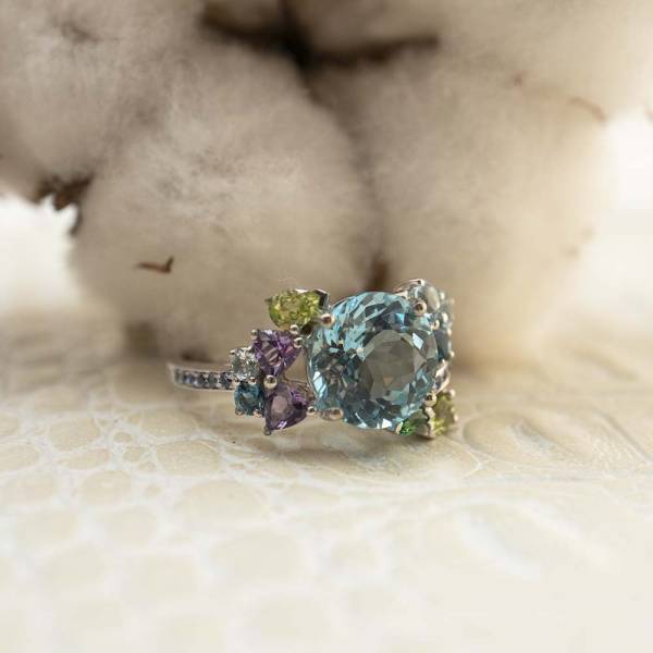 imaginez votre bague en or 18 carats ornée de pierres précieuses et fines aux tons bleus et verts. Ces nuances évoquent