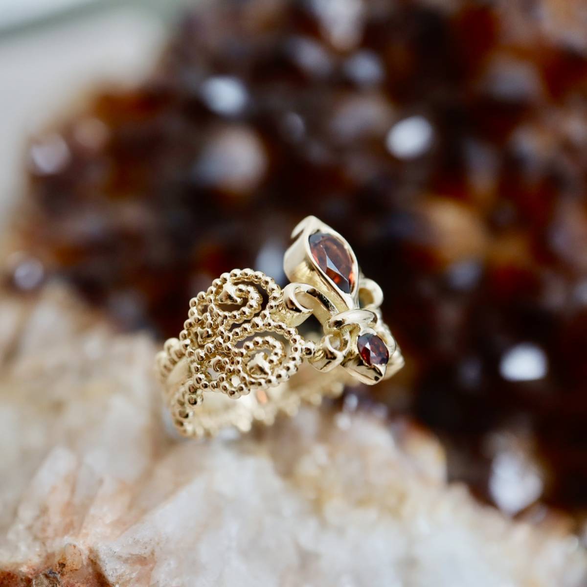 Bague fleur de lys or jaune 750 millièmes grenat Bordeaux joaillier création