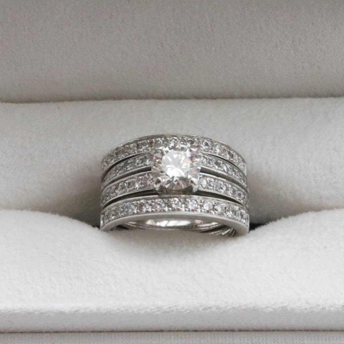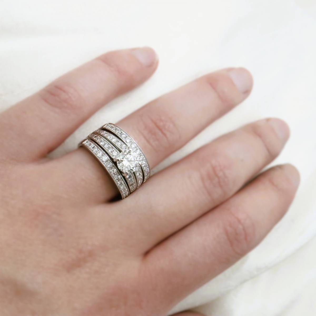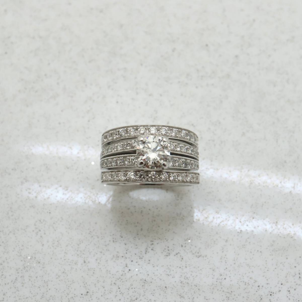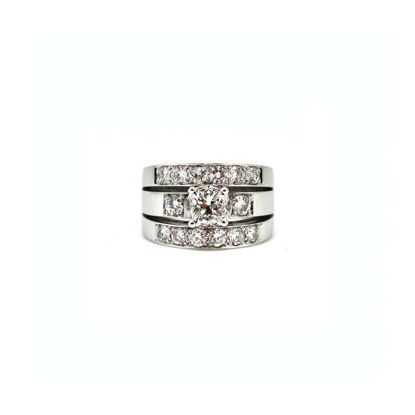 or blanc 750 millièmes est composée de trois rangs : un diamant taille brillant au centre est serti sur chaton quatre griffes, accompagné de 4 diamants taille princesse (carré) sertis rails de chaque côté. Tout autour en deux bandes extérieures, 22 diamants taille brillant sont sertis à grains.