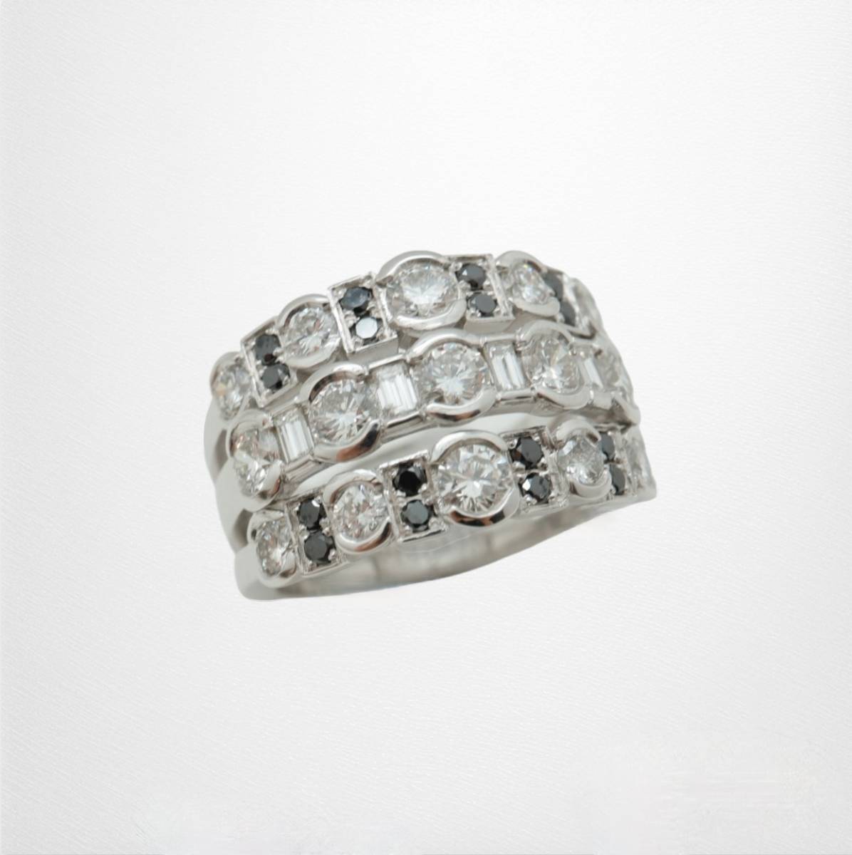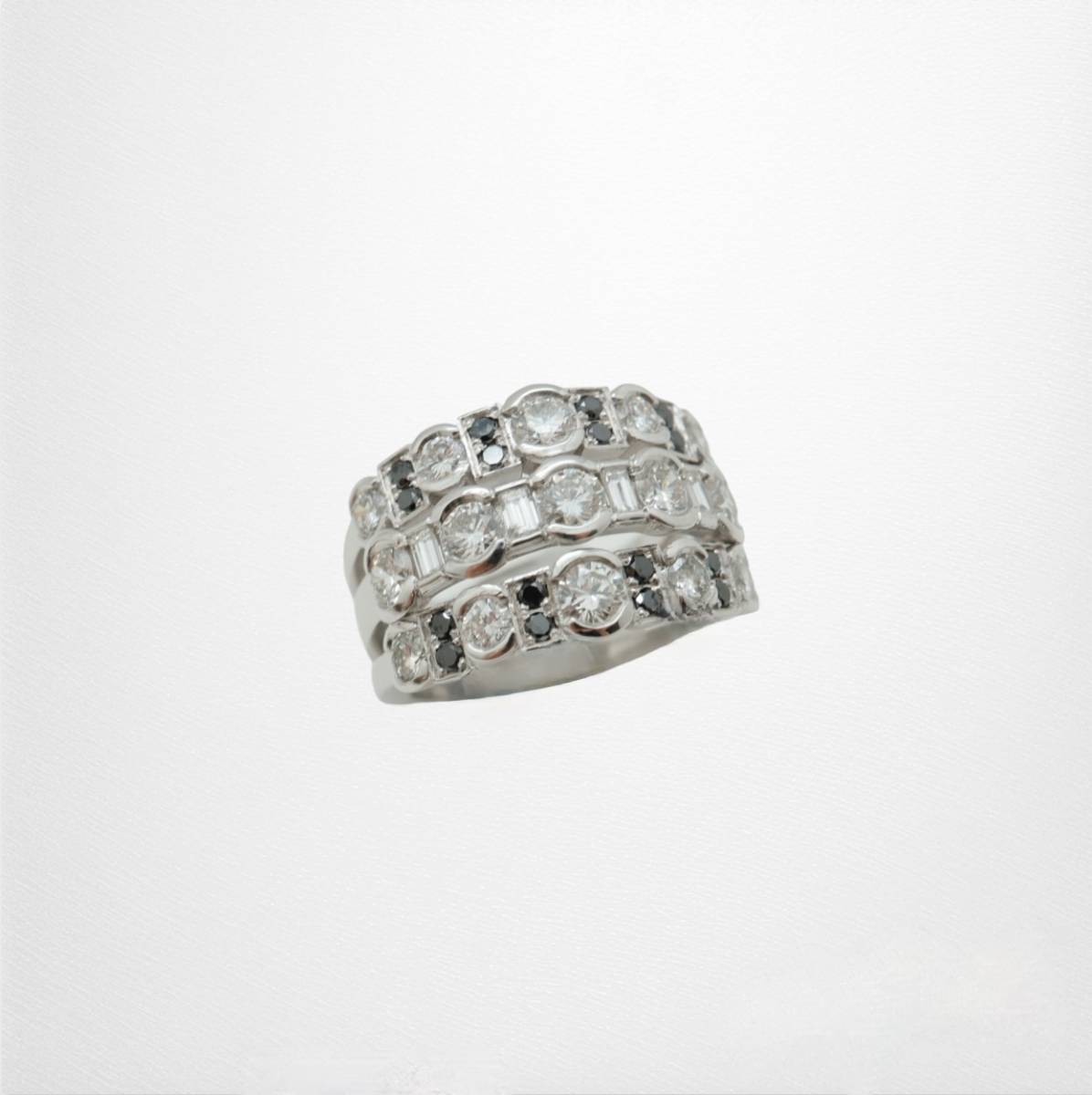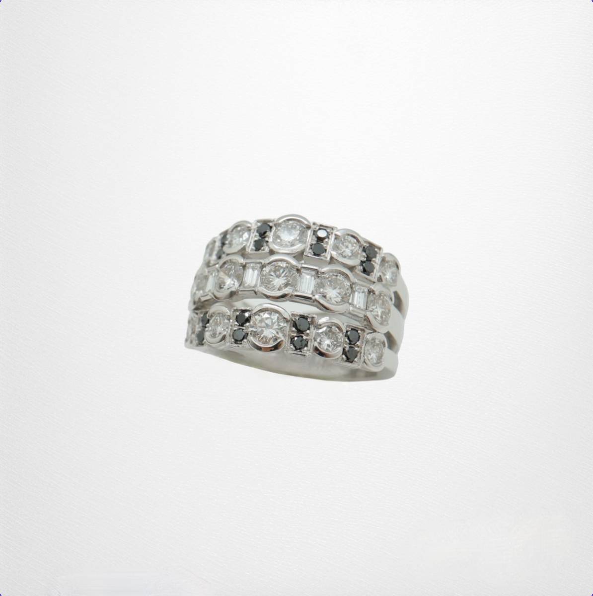 Bague large en or gris 18 carats 3 corps sertie de diamants blancs et noirs