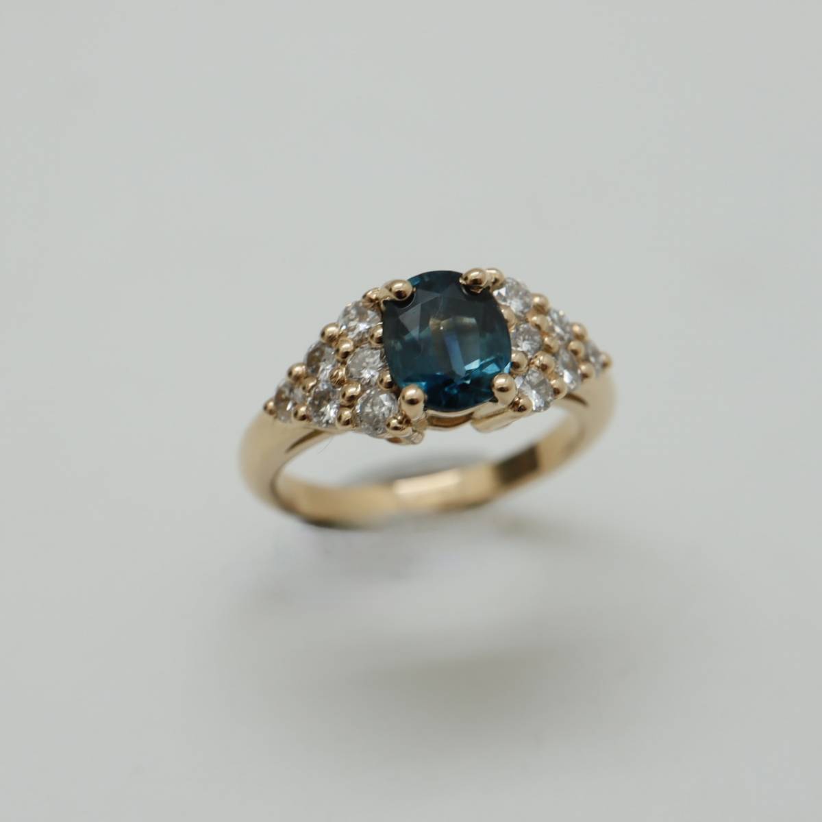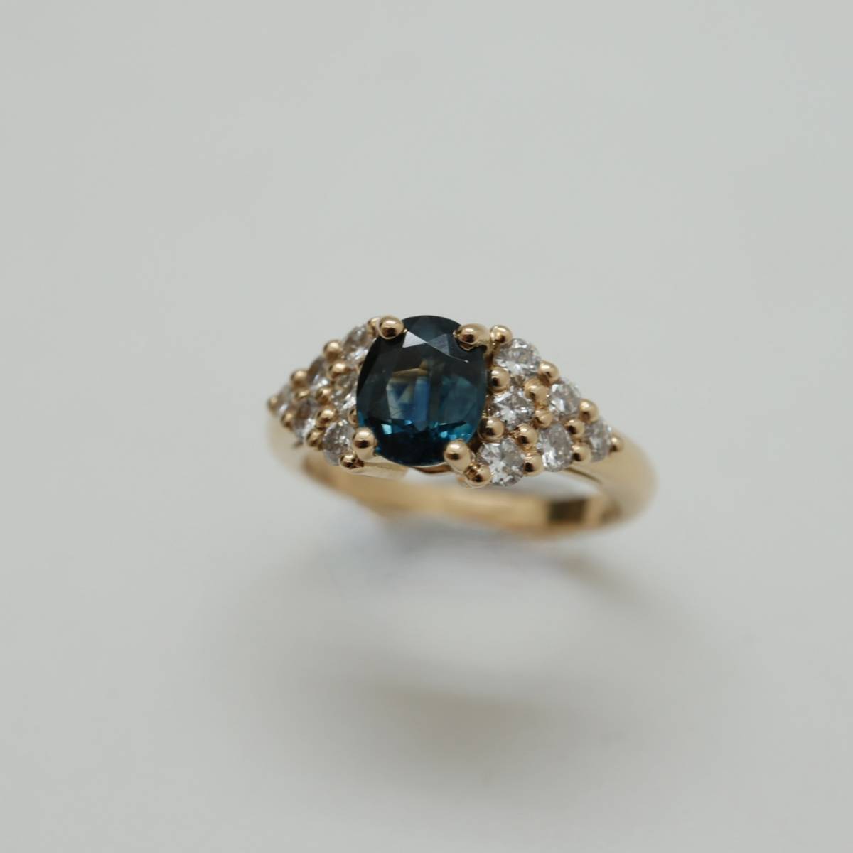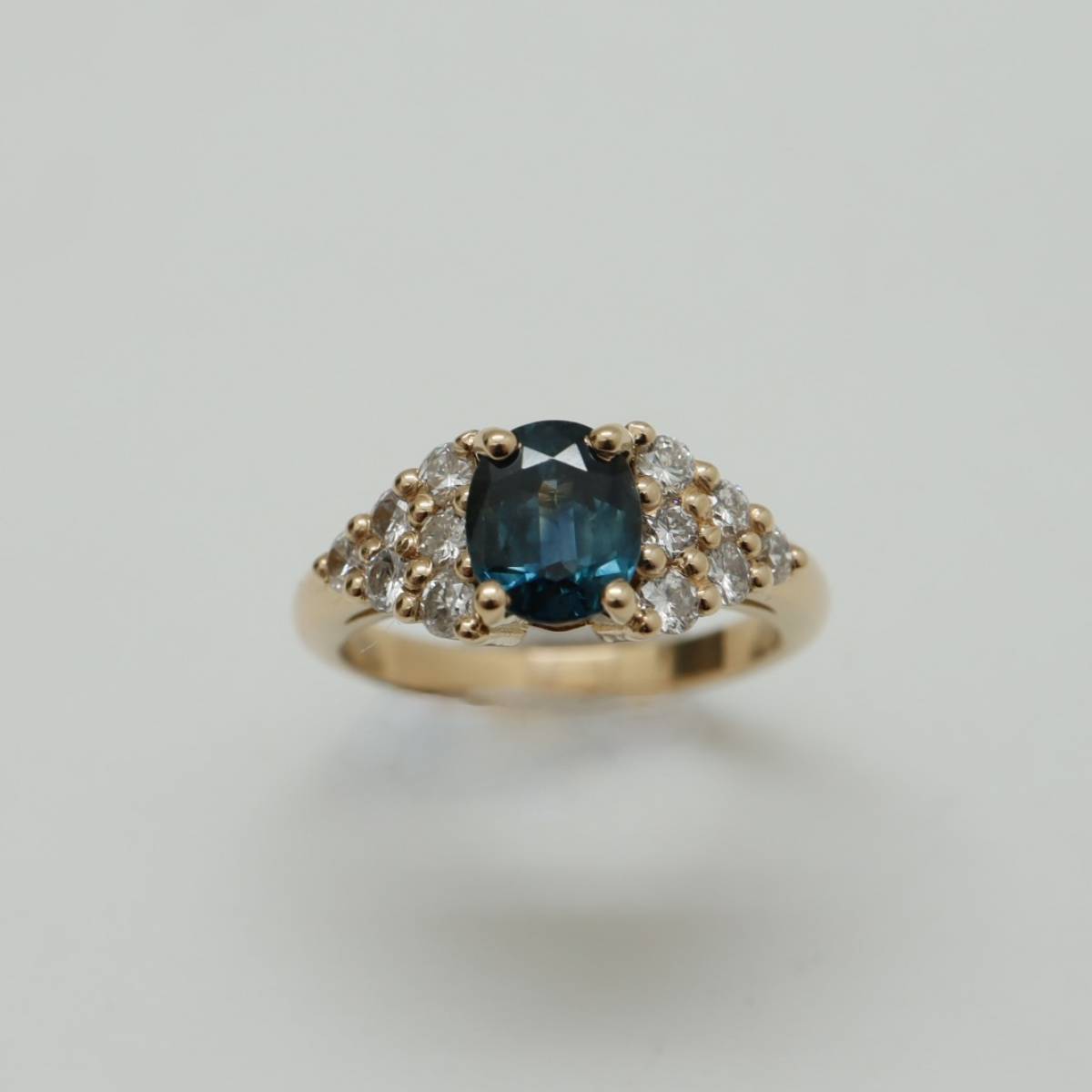 Cette bague envoûtante a été réalisée en or jaune 750 millièmes. En son centre, trône un saphir ovale, d'un bleu/vert foncé énigmatique. De chaque côté du saphir, 6 diamants taillés en brillant prennent place. Leur disposition équilibrée magnifie la pierre centrale.