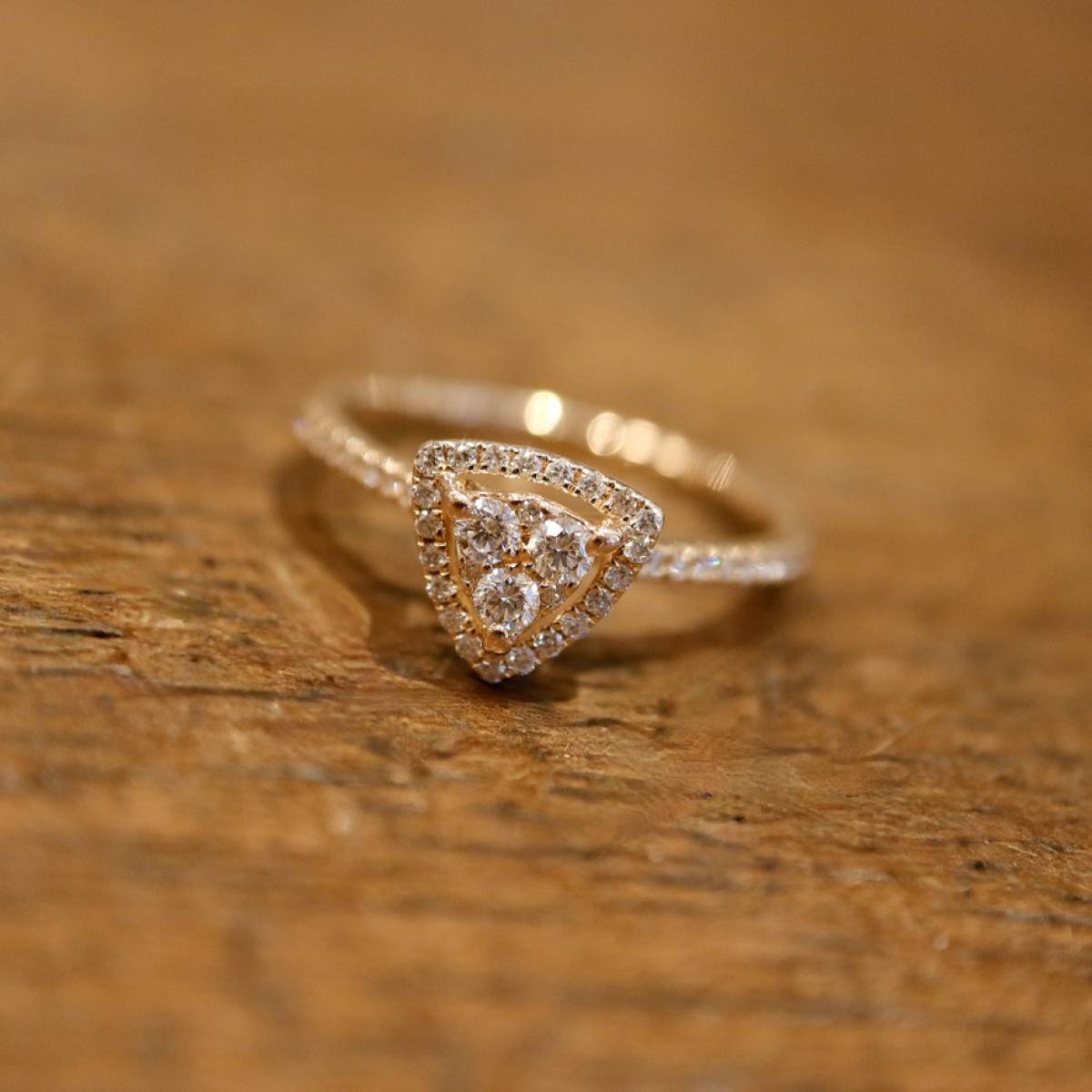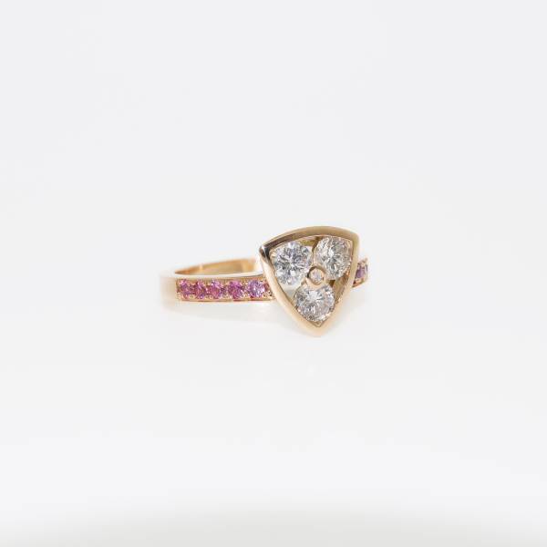 La trilogie de diamants taille brillant vient encercler le brillant en serti clos au centre, et sont accompagnés d'un pavage de saphirs roses sur le corps en or rose 750 millièmes.