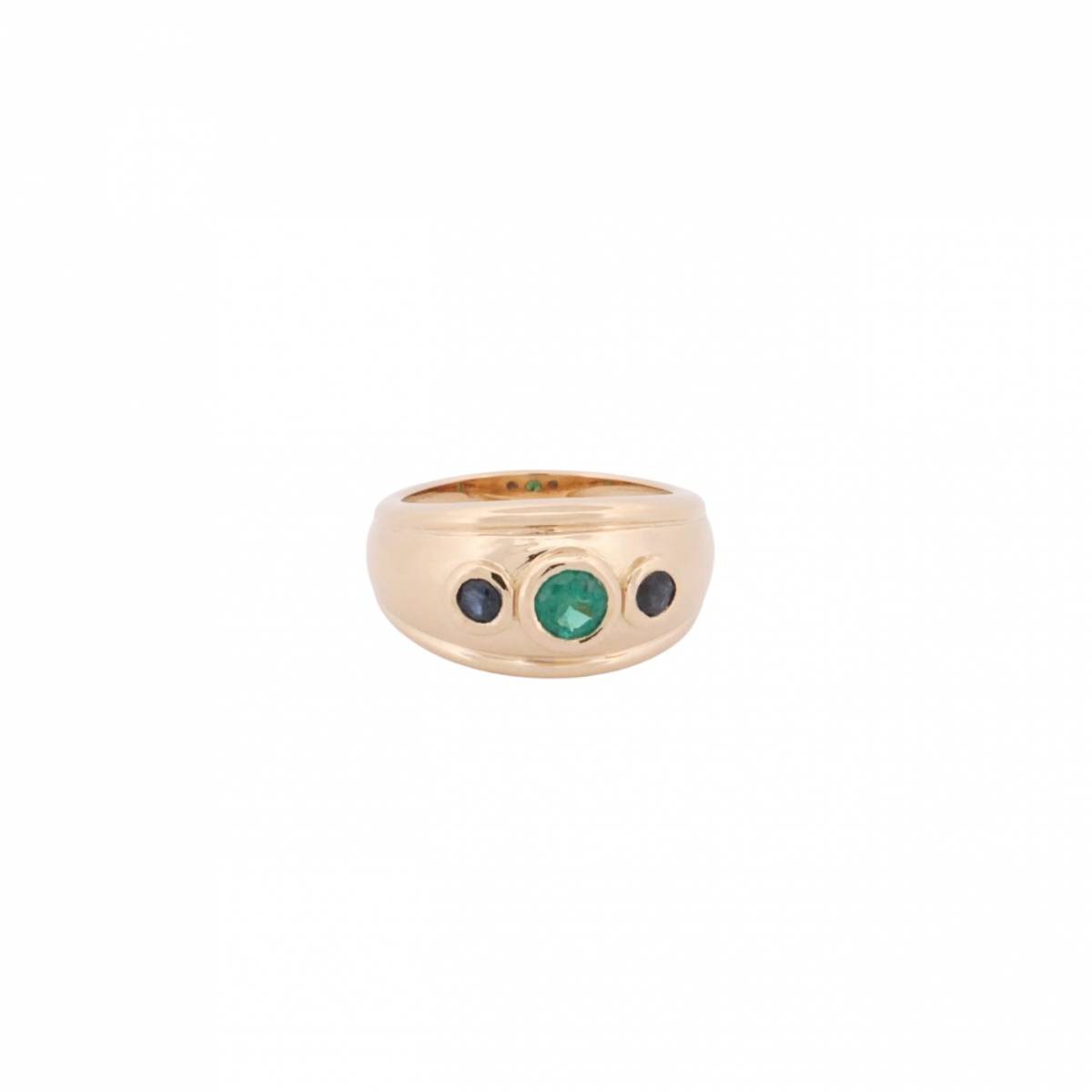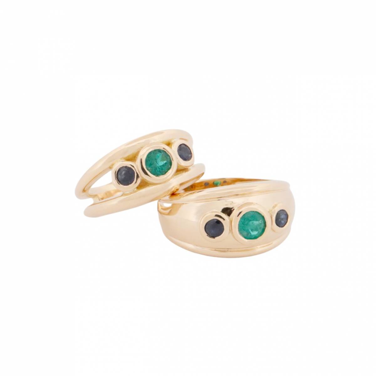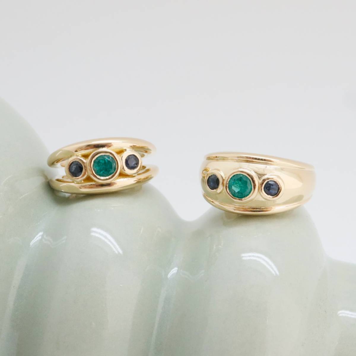 Chaque bague est ornée d’une trilogie raffinée : une émeraude ronde au centre, d’un vert profond et vibrant, encadrée de deux saphirs ronds à la teinte bleutée intense. L’émeraude, symbole de renouveau, capte immédiatement le regard, tandis que les saphirs apportent équilibre et profondeur à l’ensemble. Leur sertissage délicat met en valeur la lumière naturelle des pierres et souligne la noblesse de l’or jaune 18 carats.