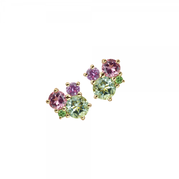 Boucles d'oreilles en or rose sertie de pierres fines, tourmalines, tsavorites, saphirs roses et quarts verts.