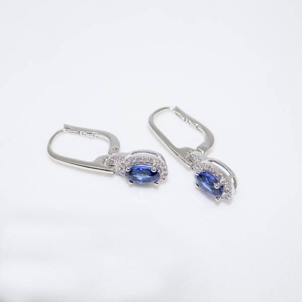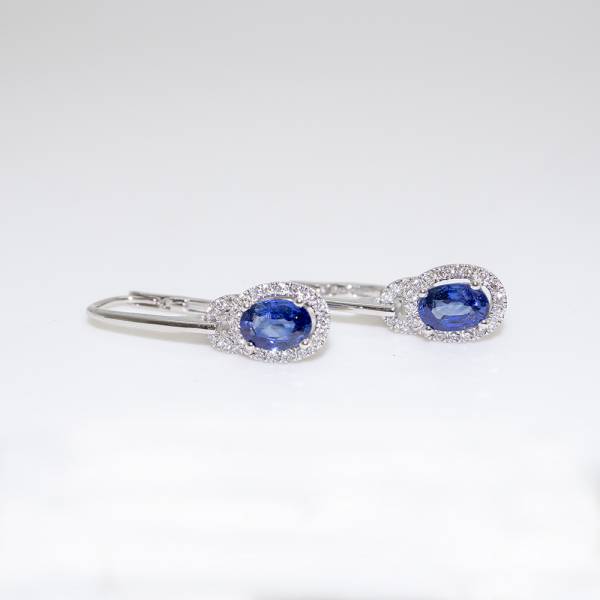 Cette paire de boucles d'oreilles est composé de 48 diamants taille brillant pour 0,22 carats qualité G-SI ainsi que de deux saphirs ovales pour 1,40 carats.