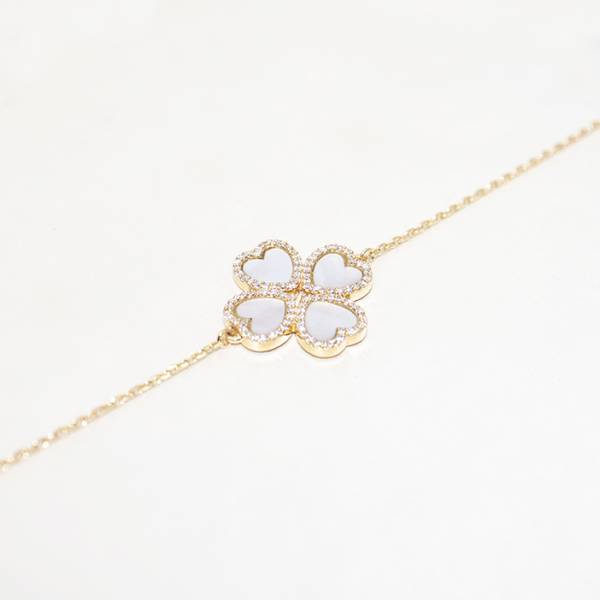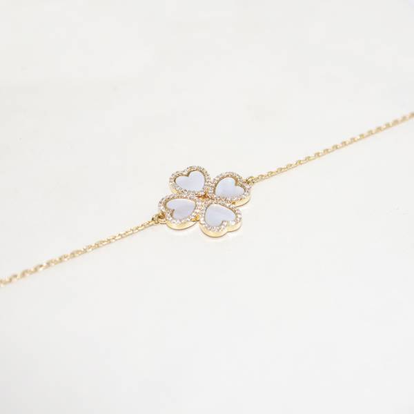 Ce bracelet délicat est composé de quatre nacre en forme de cœur ainsi que de 96 diamants taille brillant pour un poids de 0,21 carats. Rendez-vous au sein de notre boutique-atelier, au cœur de Bordeaux Caudéran, pour découvrir tous nos modèles de bijoux ; des bijoux pour femmes et des bijoux pour hommes : bagues, bracelets, boucles d'oreilles, colliers, boutons de manchette...