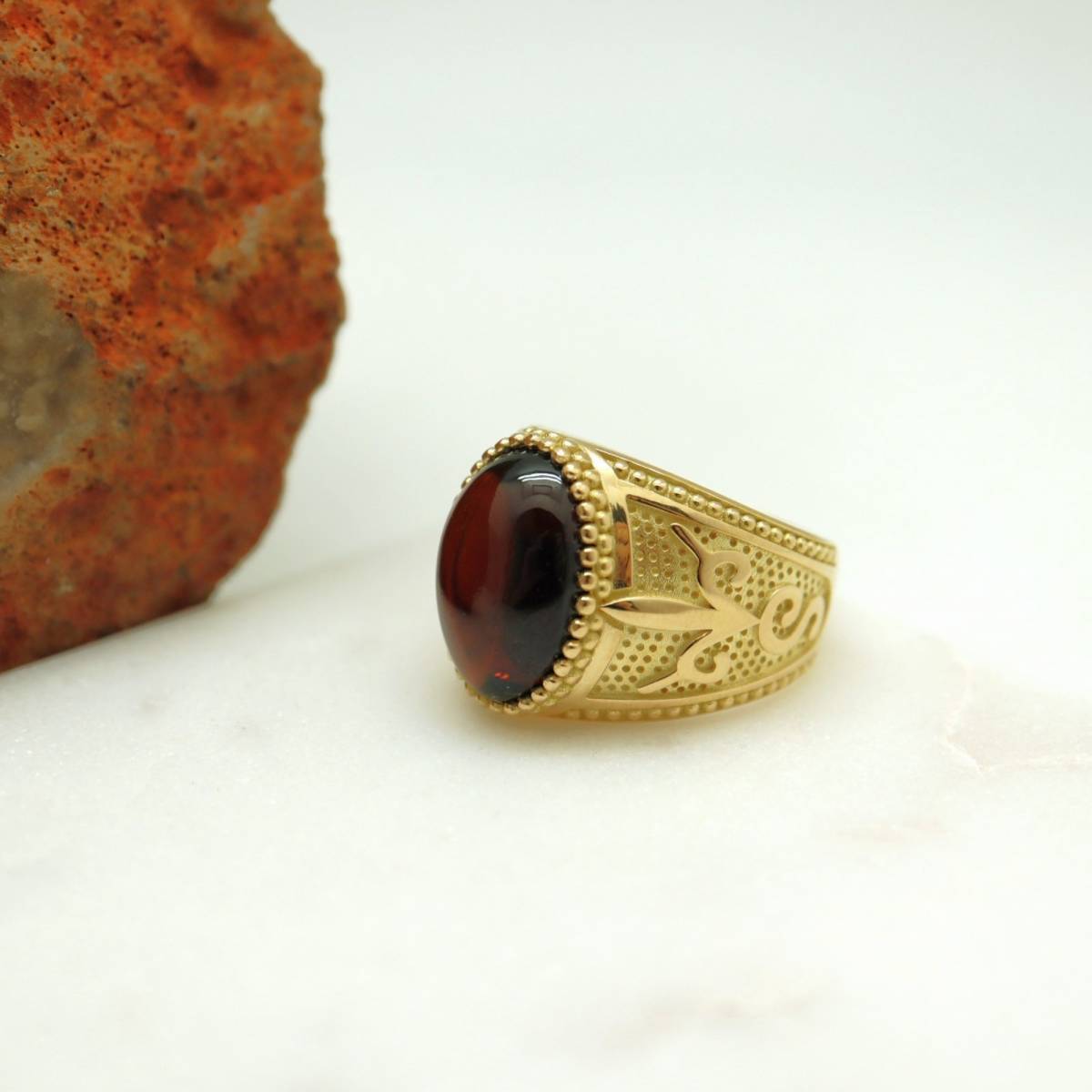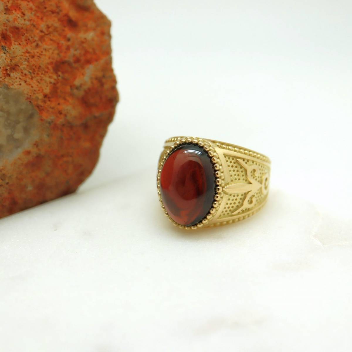 Au centre de la pièce, un magnifique grenat ovale en cabochon déploie sa couleur orangée avec ses nuances profondes de bordeaux. Raffinée et intense, cette pierre confère à la bague un caractère à la fois chaleureux et mystérieux. Elle évoque la passion maîtrisée, la force intérieure, et s’accorde parfaitement à l’éclat feutré de l’or jaune.