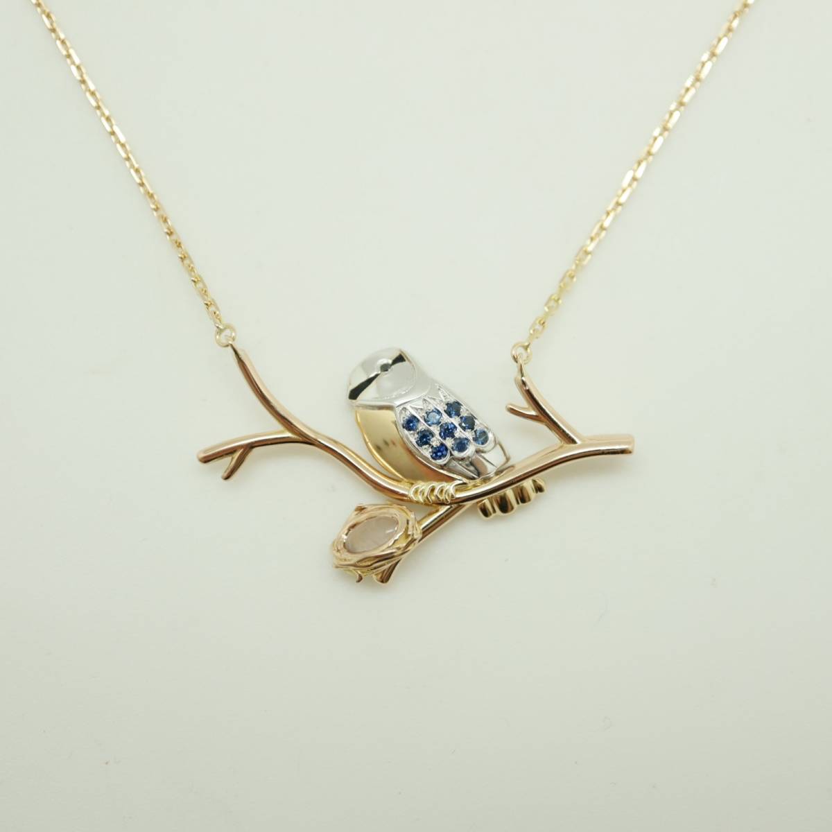 Notre Maison vous présente une de ses magnifiques créations : un collier en or 750 millièmes élégant au design raffiné, mettant en valeur une mésange délicatement façonnée en or jaune et or blanc. Véritable pièce de joaillerie artisanale, ce bijou associe la finesse des métaux précieux à l’éclat des pierres naturelles pour créer une composition poétique et lumineuse.
