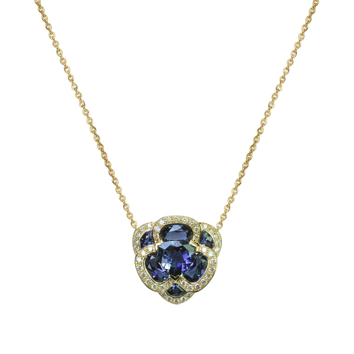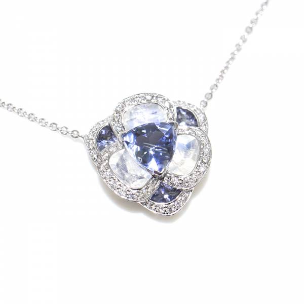 Sur une chaîne maille forçat ronde or blanc 750 millièmes, ce motif est formé de iolites, pierres de lune et diamants.
