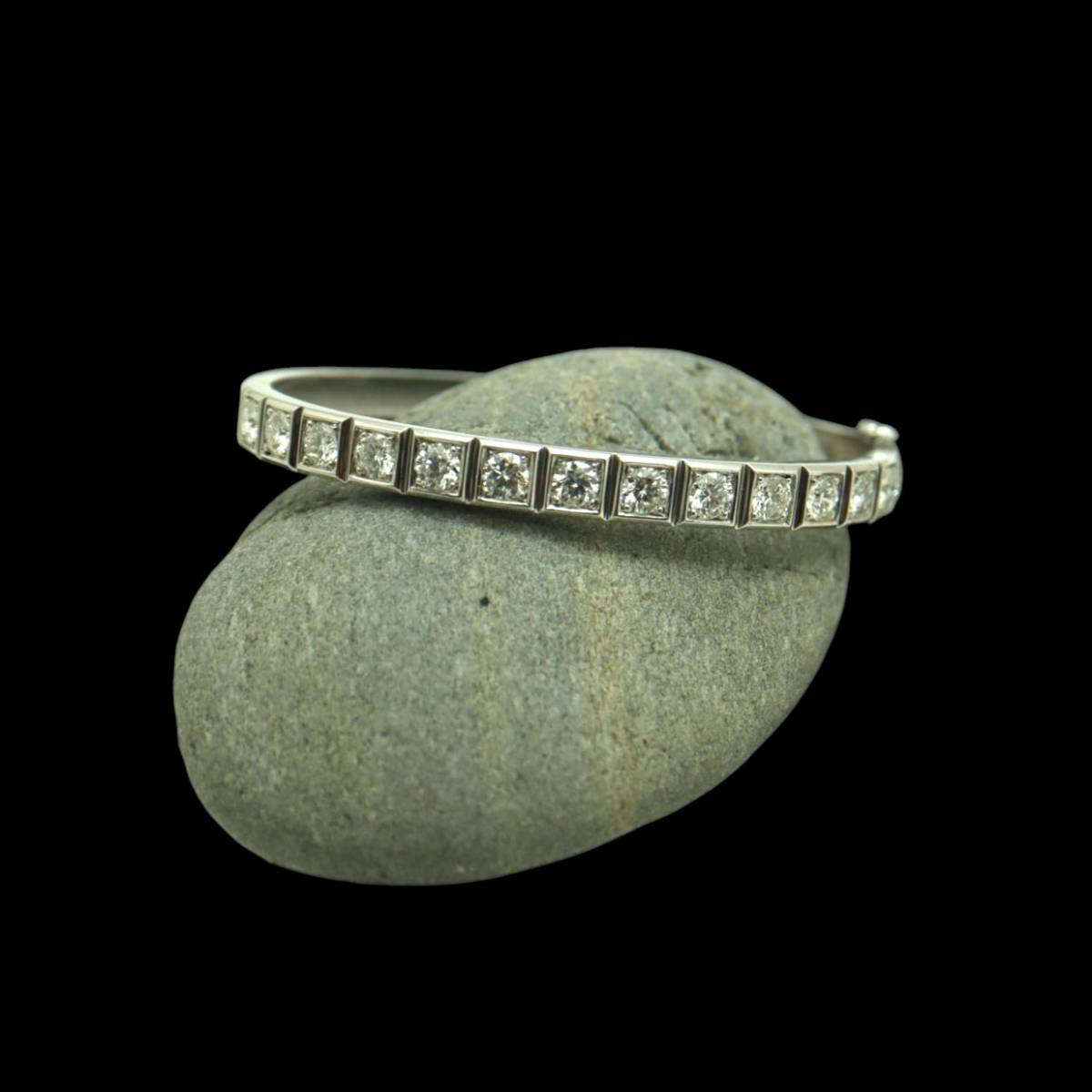 Ce jonc massif en or blanc 750 millièmes incarne l’élégance intemporelle et le savoir-faire joaillier dans toute sa splendeur. Son design géométrique se distingue par un quadrillage minutieusement ciselé, où chaque carré abrite un diamant taille brillant, serti à griffes avec une précision remarquable. Les pierres, parfaitement alignées, captent la lumière sous tous les angles, créant un éclat continu et raffiné qui sublime le poignet.