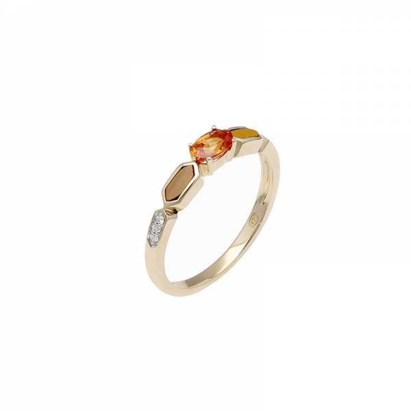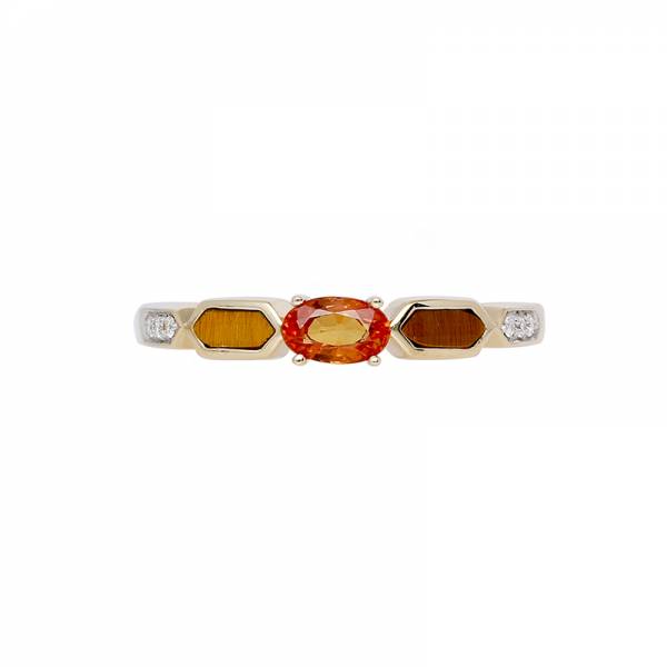 - Bague en or jaune 750 millièmes, saphir orange et œil de tigre et diamants