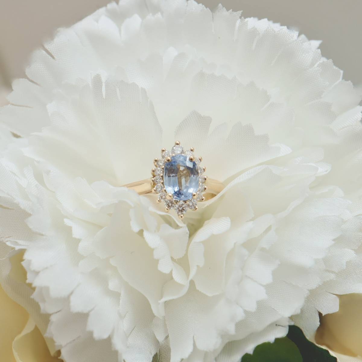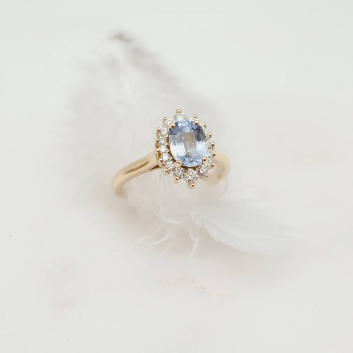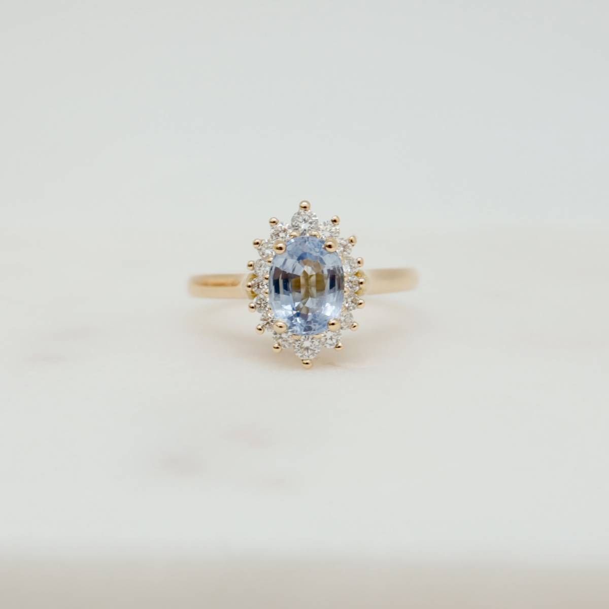 fidélité. L'entourage diamants forme un dégradé de lumière qui encadre le saphir avec une
