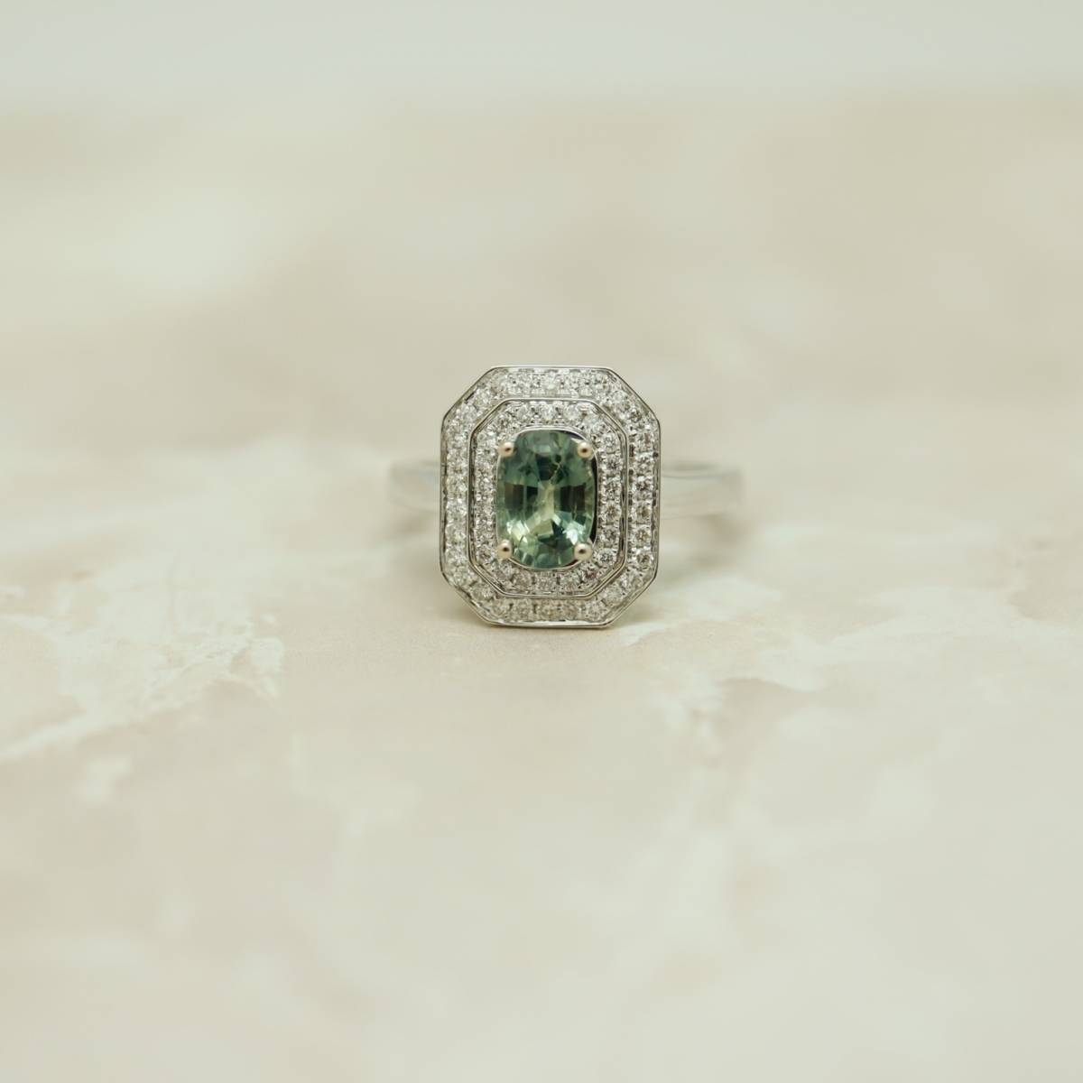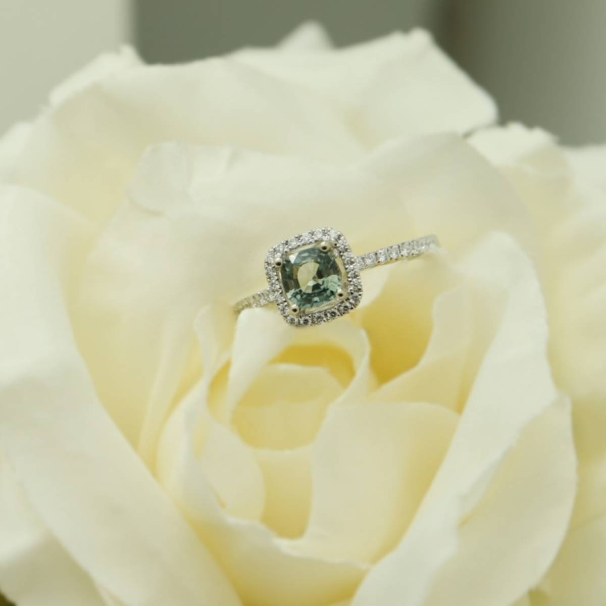 Le saphir vert est une pierre parfaite pour une bague portée tous les jours, comme bague de fiançailles. Il résiste bien aux rayures, aux chocs et au temps.